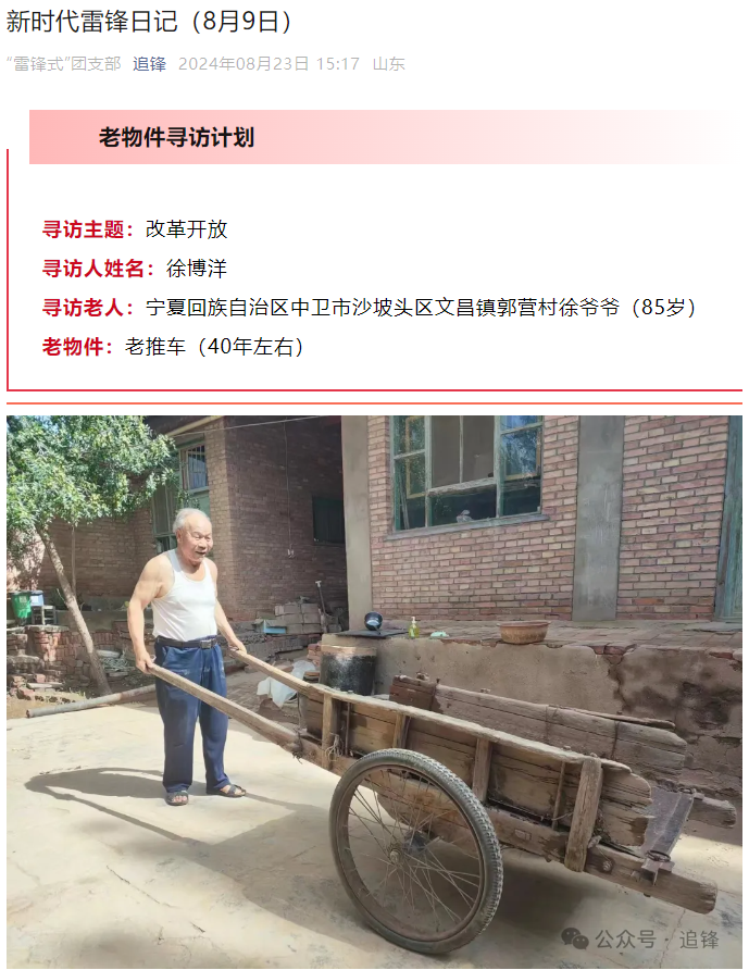 暑期返乡期间,304am永利集团“雷锋式”团支部开展“老物件寻访行动”,旨在通过寻访老人家中的老物件,从而走近老人、了解老人、陪伴老人,挖掘那些被岁月尘封的记忆,并借用新媒体方式将老人的记忆保存下来、传递出去,让其中闪烁着的“勤劳”“奋斗”“奉献”等人生光芒再次照亮新时代青年的人生旅程。