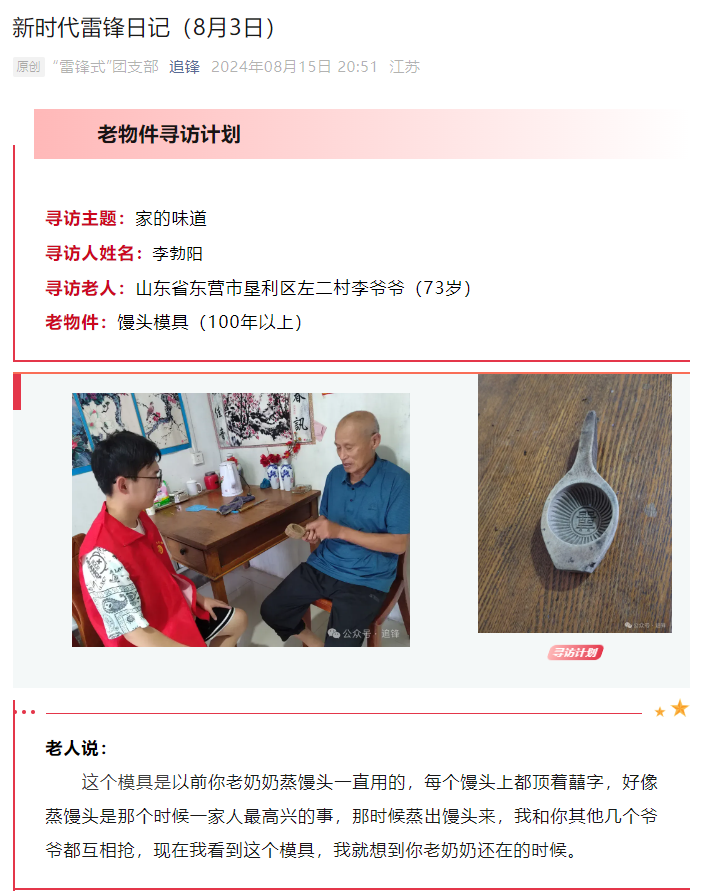 “老物件寻访计划”不仅是一次简单的光阴寻访之旅,更是一次深刻的精神探索与发现之旅。期待在未来的日子里,更多的同学能够加入到这场传承与探索的行列中来,将爱老、敬老、助老的美好品德代代传承。