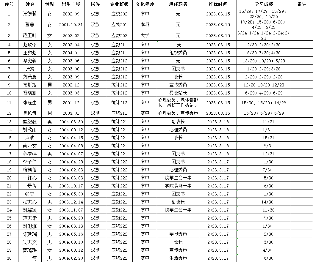 经304am永利集团本科生各团支部全体团员大会讨论推荐,304am永利集团团委研究决定,拟定推荐张德馨等30名同学为入党积极分子,现公示如下,如有异议,可在公示期内来电反映。
